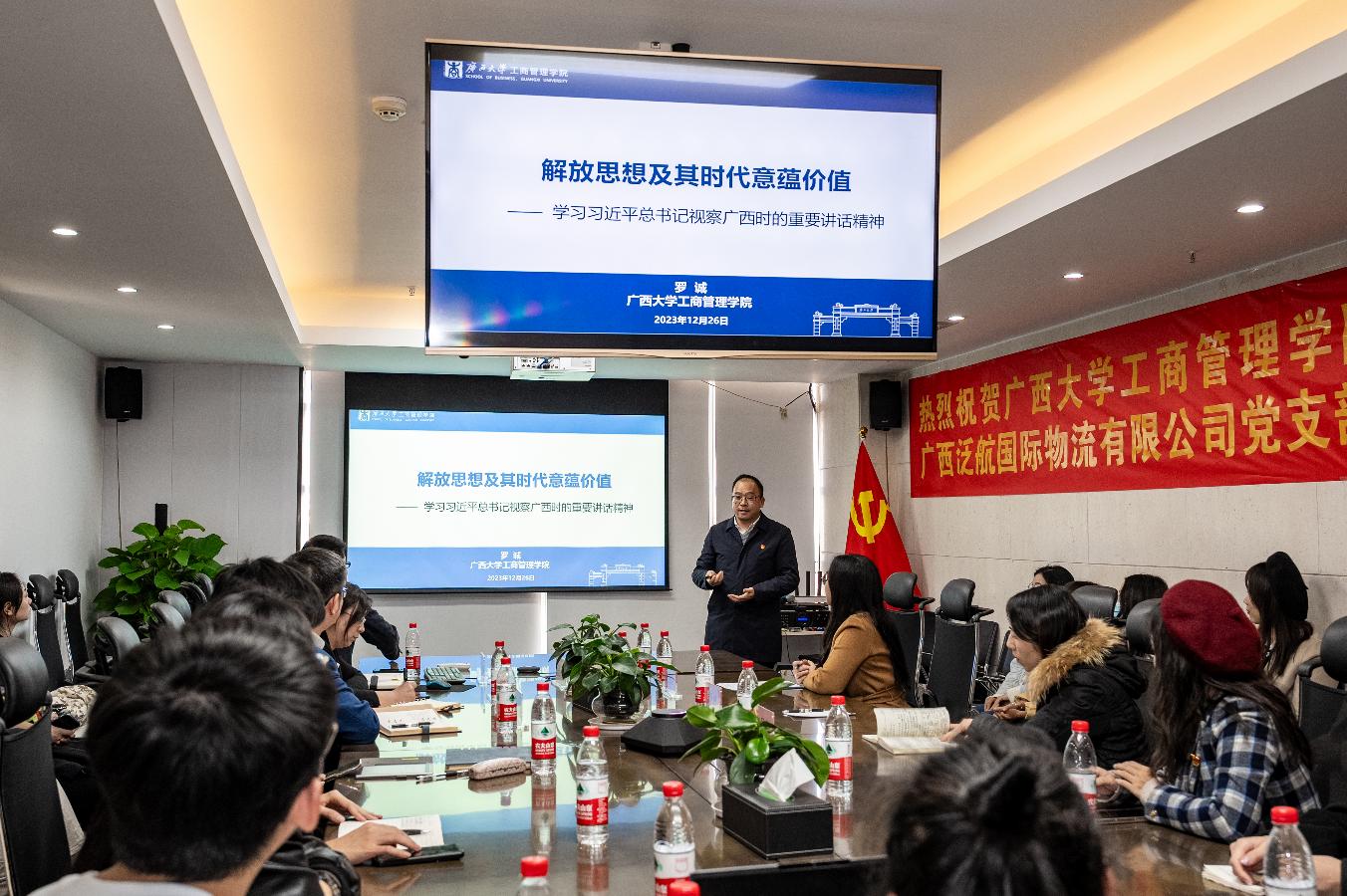 罗诚书记以《解放思想及其时代意蕴价值》为题,现场为大家上了一堂生动的党课。课上,他就如何准确把握解放思想的科学内涵、时代意蕴价值及方法论等方面,结合自身学习体会及国内外的形势对习近平总书记视察广西的重要讲话精神进行解读,并希望党员同志提高政治站位,把握时代主题,自觉把思想和行动统一到习近平总书记重要讲话精神上来,解放思想、创新求变,在各自岗位上谱写干事创业的新篇章。同时希望双方以此次联学共建为契机,以党建为引领,互学互鉴,共同推动基层党建工作有效开展。