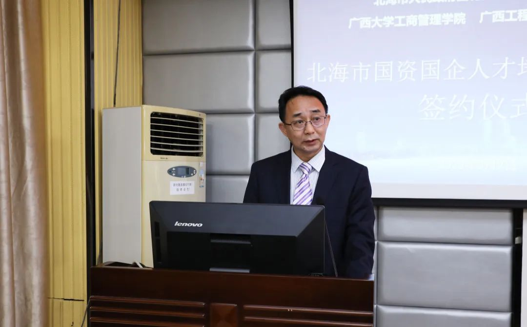 副院长刘民坤,广西工程咨询集团有限公司党委副书记左俊兰作为签约代表签署《北海市国资国企人才培养教育基地共建合作框架协议书》。