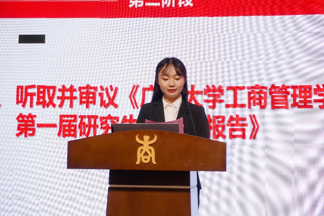 第一届研究生会工作报告》,总结过去一年研究生会在思想引领、学术创新、就业指导、文体娱乐、学生服务等方面开展的一系列成效显著的工作。她表示,将继续为建设有制度、有引领、有创新、有和谐的研究生会而奋斗,继承和发扬自信自强、迎难而上的西商精神,为建设师生满意的“四有”研究生会贡献青春力量。