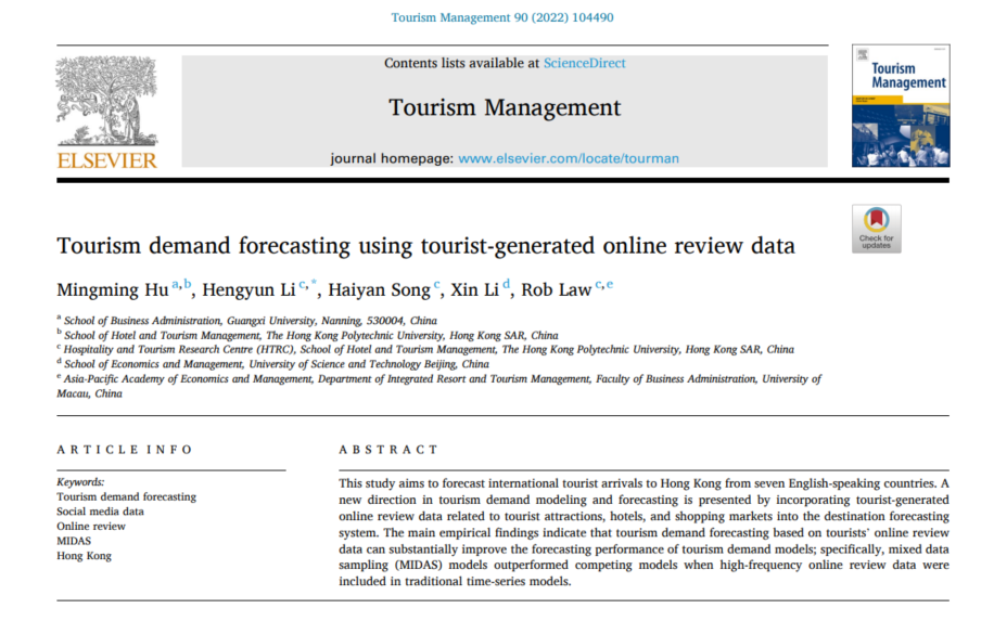 Hu, M., Li, H., Song, H., Li, X., & Law, R. (2022). Tourism demand forecasting using tourist-generated online review data. Tourism Management, 90, 104490.