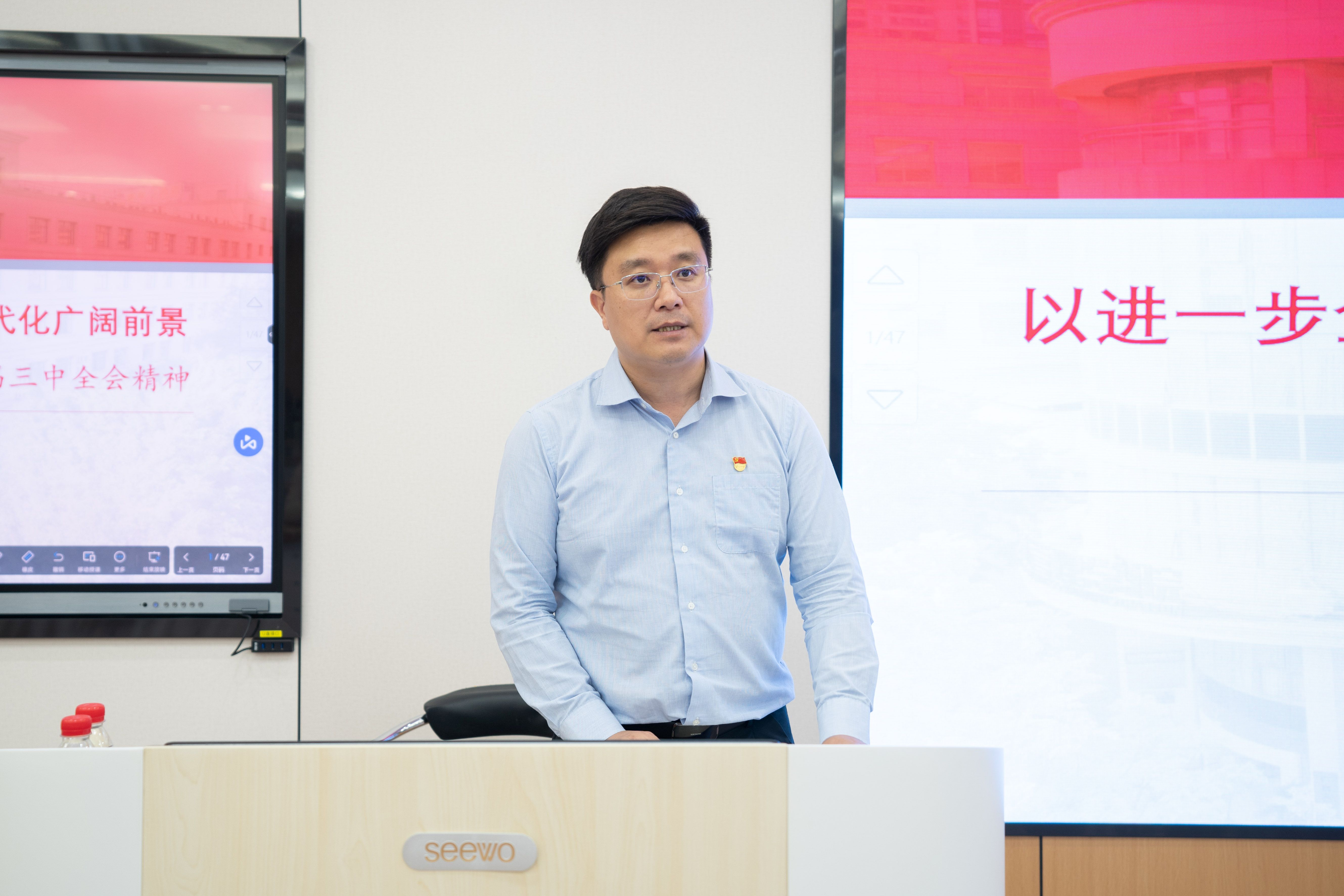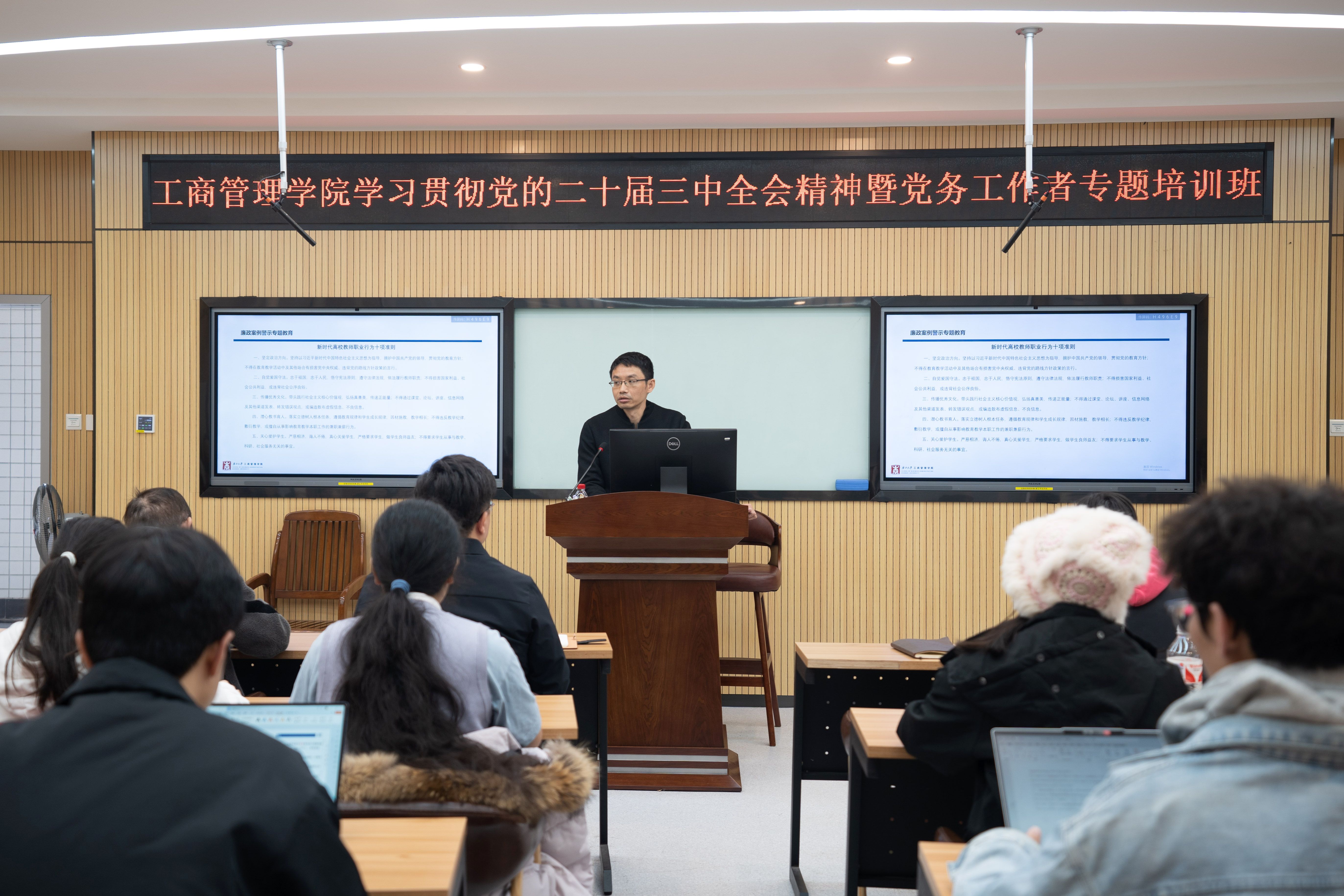 培训期间,党委书记黄晋以“学习贯彻党的二十届三中全会精神,开辟中国式现代化新前景”为题,围绕深刻学习领会进一步全面深化改革的主题、重大原则、重大举措和根本保证,进行了深入浅出的专题教学。学院党委副书记、纪委书记肖克宁从意识形态、学术诚信、科研经费、生活作风、行为规范等五大方面,对师生进行了廉政教育。党委组织员黄照温就党建业务进行培训,详细阐述了党员发展、组织生活、党员教育管理等关键环节的具体要求和操作流程。