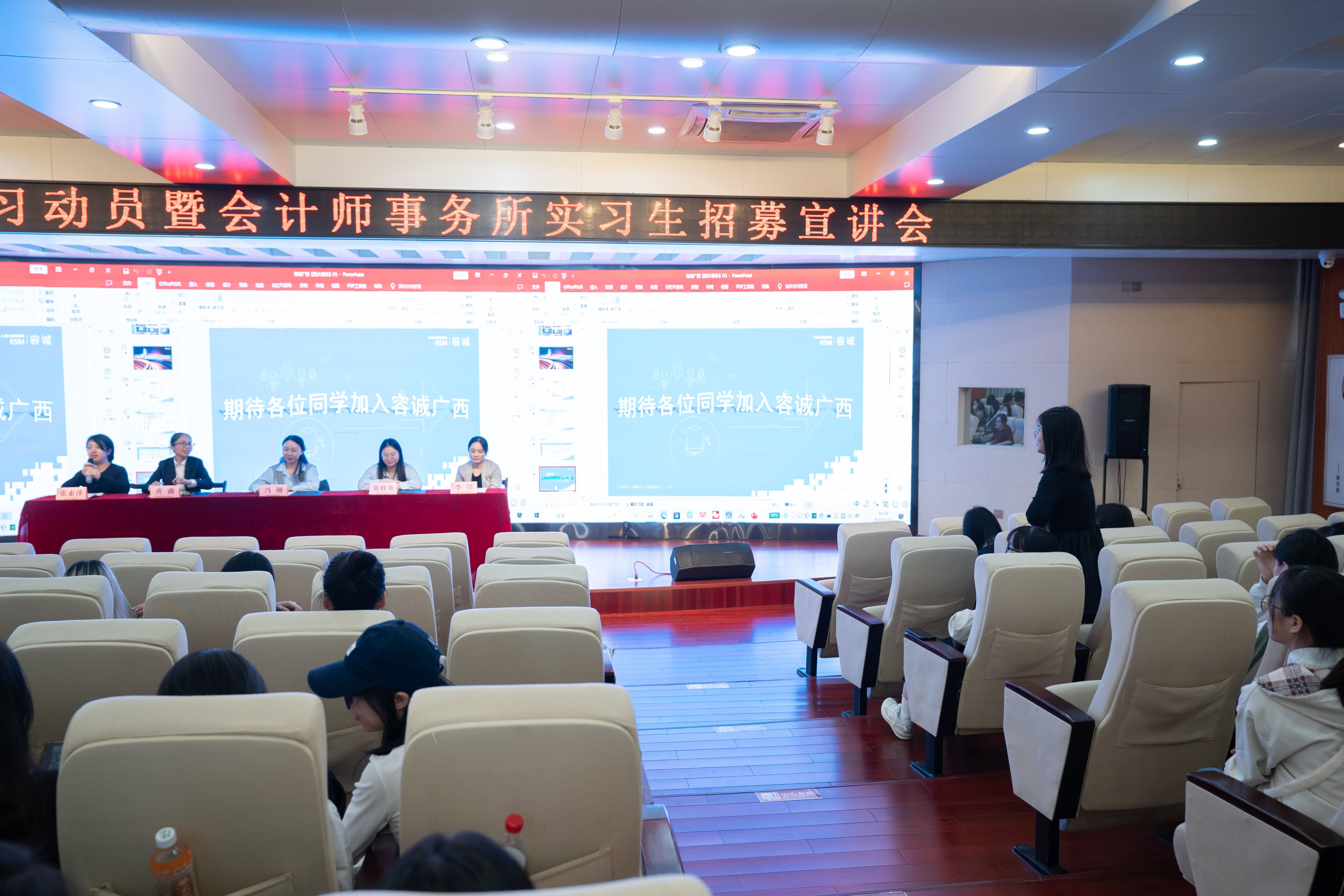 与广西注册会计师协会、广西五家会计师事务所联合举办2024年财会本科毕业生实习动员会暨会计师事务所实习生招募宣讲会。广西壮族自治区财政厅注册会计师管理中心四级调研员张阗甜、学院党委副书记肖克宁、副院长申韬出席会议,财会专业本科毕业班班主任和全体学生参加会议。
