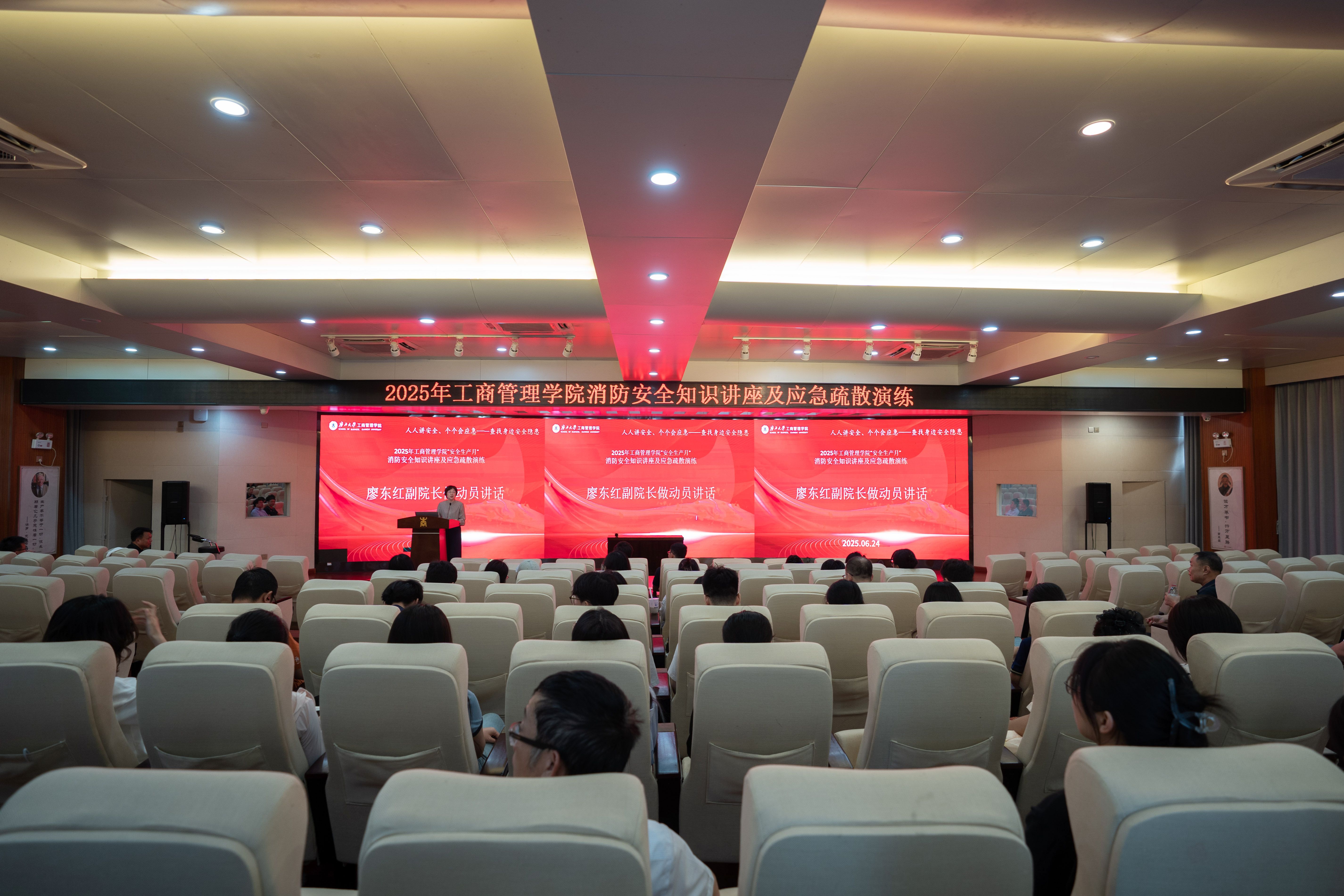 6月24日下午,学院在128报告厅举办消防安全知识讲座及应急疏散演练,学院党委书记黄晋、副书记肖克宁及120 余名师生参与培训及疏散演练。副院长廖东红作动员讲话,学校保卫处消防安全管理岗负责人黄光电及工作人员到场指导工作。