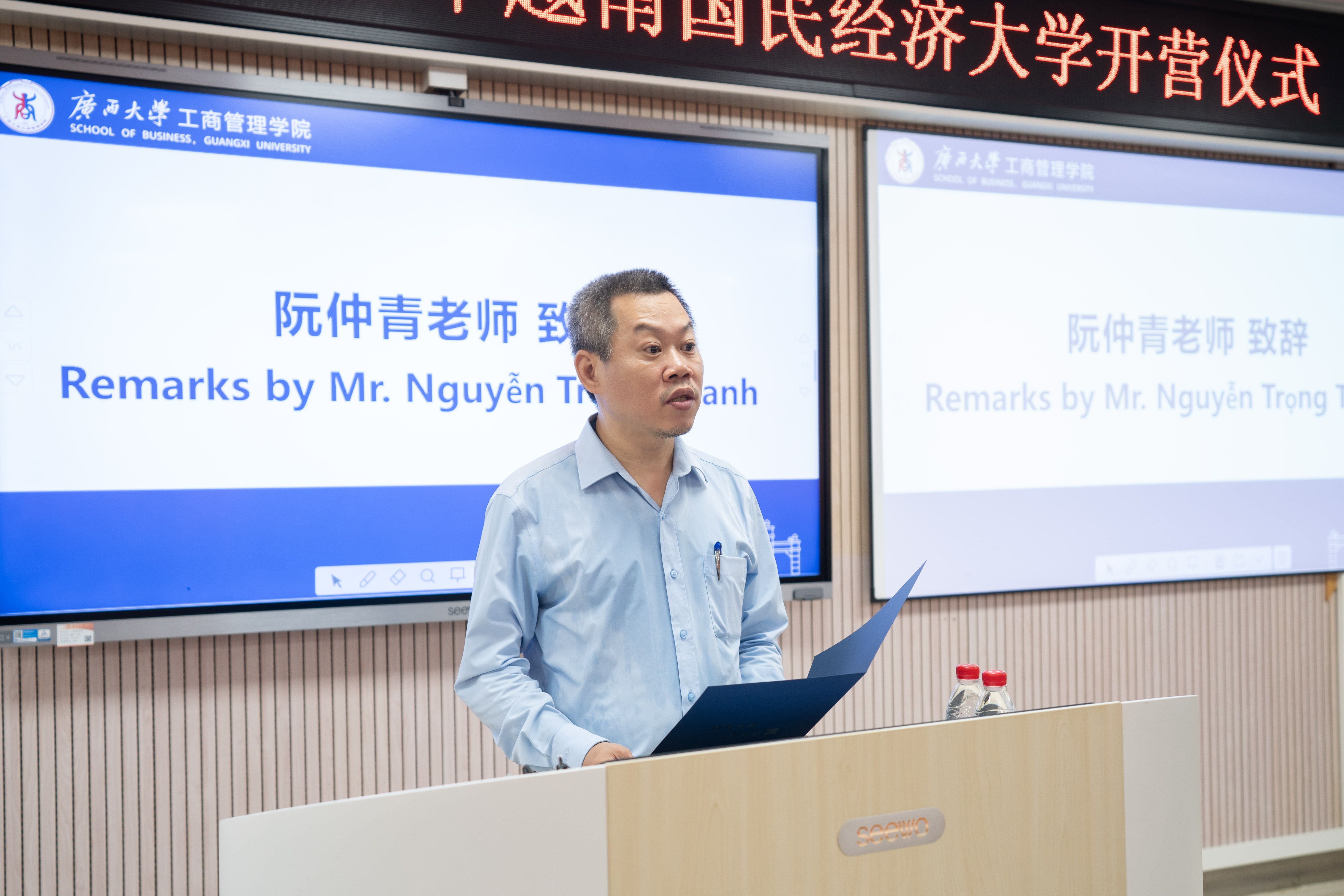 黄晋回顾了中越“同志加兄弟”的传统友谊,强调青年交流对深化两国关系的重要性。他介绍了学院的发展历史和在商科教育领域取得的成绩,他指出,本次精心筹备的夏令营,是学院国际化办学理念的生动诠释,希望学员们通过课程学习、企业参访与文化体验,深入了解中国经济发展模式,感受广西多元文化魅力,成为中越友好合作的见证者与参与者。