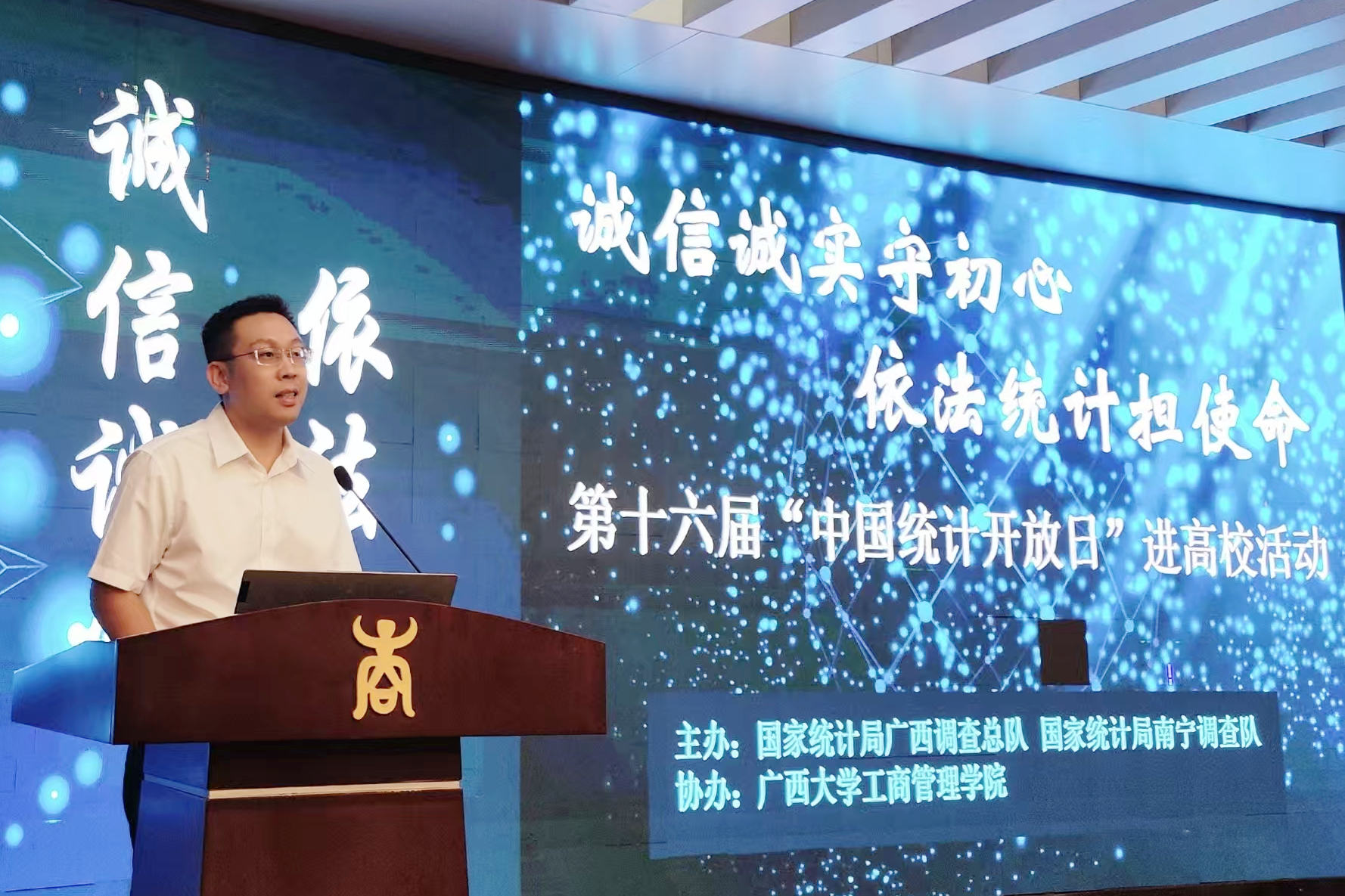 学院党委书记黄晋在讲话中重点介绍了学院历史沿革以及师资队伍、人才培养、科研创新等方面情况;他强调本次活动是“政校协同育人”的重要实践,希望同学们以活动为契机,牢记“诚信诚实、依法统计”理念,努力成为统计事业的可靠力量。学院也将深化与南宁调查队的合作,推动统计知识普及、实践教学与科研创新融合。