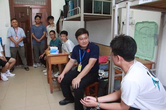 学院党委副书记黄晋和团委副书记岑汉成,走进本科生男生新生宿舍,关怀与问候每一位23级新生。他们认真询问新生来校路途情况,了解新生在学习、生活方面的需求,关心各地同学对广西气候适应情况,耐心解答各个同学来校后遇到的实际困难。