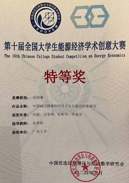 朱帮助教授带领的研究生团队在此次竞赛中脱颖而出,取得佳绩。其中,“中国减污降碳协同度评估与驱动因素研究”(团队队长:田超,指导老师:朱帮助)入围全国总决赛,经过现换妻游戏
