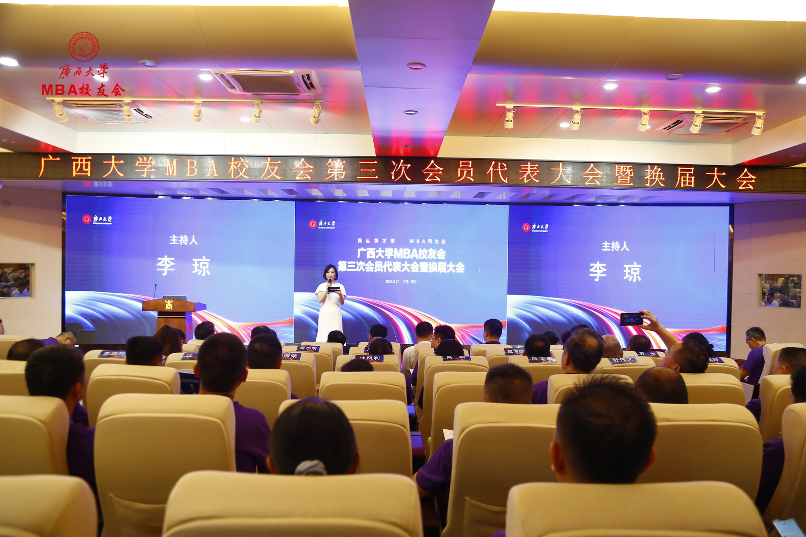区直校友会代表甘向群、MBA校友代表张程在大会上发言。广州、深圳、区直、南宁市、柳州、桂林、玉林、梧州、贺州、贵港、百色、崇左、SMBA等校友会,EMBA同学会,校友足球协会、乒乓球协会、排球协会等校友代表,以及香港浸会大学MBA、中山大学MBA、暨南大学MBA、深圳大学MBA等嘉宾代表皆到场祝贺。大会还收到了各地兄弟校友会、校友发来的祝贺视频和贺信贺词。最后,换届大会在嘹亮的校歌声中圆满结束。