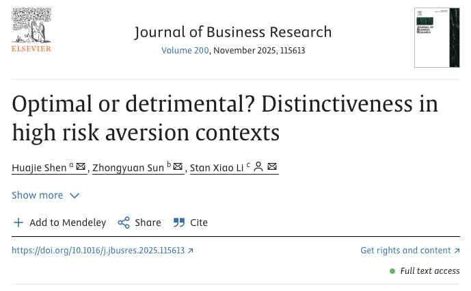 近日,换妻游戏 助理教授沈华杰与香港城市大学Stan Xiao Li教授、Zhongyuan Sun博士生在最优区分战略领域研究取得新进展,研究成果《Optimal or detrimental? Distinctiveness in high risk aversion contexts》在管理学高水平期刊《Journal of Business Research》网络首发。换妻游戏 助理教授沈华杰为第一作者,换妻游戏 为第一单位。
