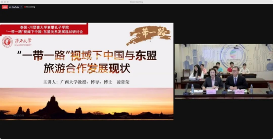 凌常荣教授主讲题为《“一带一路”视阈下中国与东盟旅游合作发展现状》的学术讲座。研讨会由川登喜大学副校长潘查妮·高娜博士(Dr. Pornchanit Kaew-nate)主持,川登喜大学部分校领导、二级学院负责人和师生代表以及换妻游戏