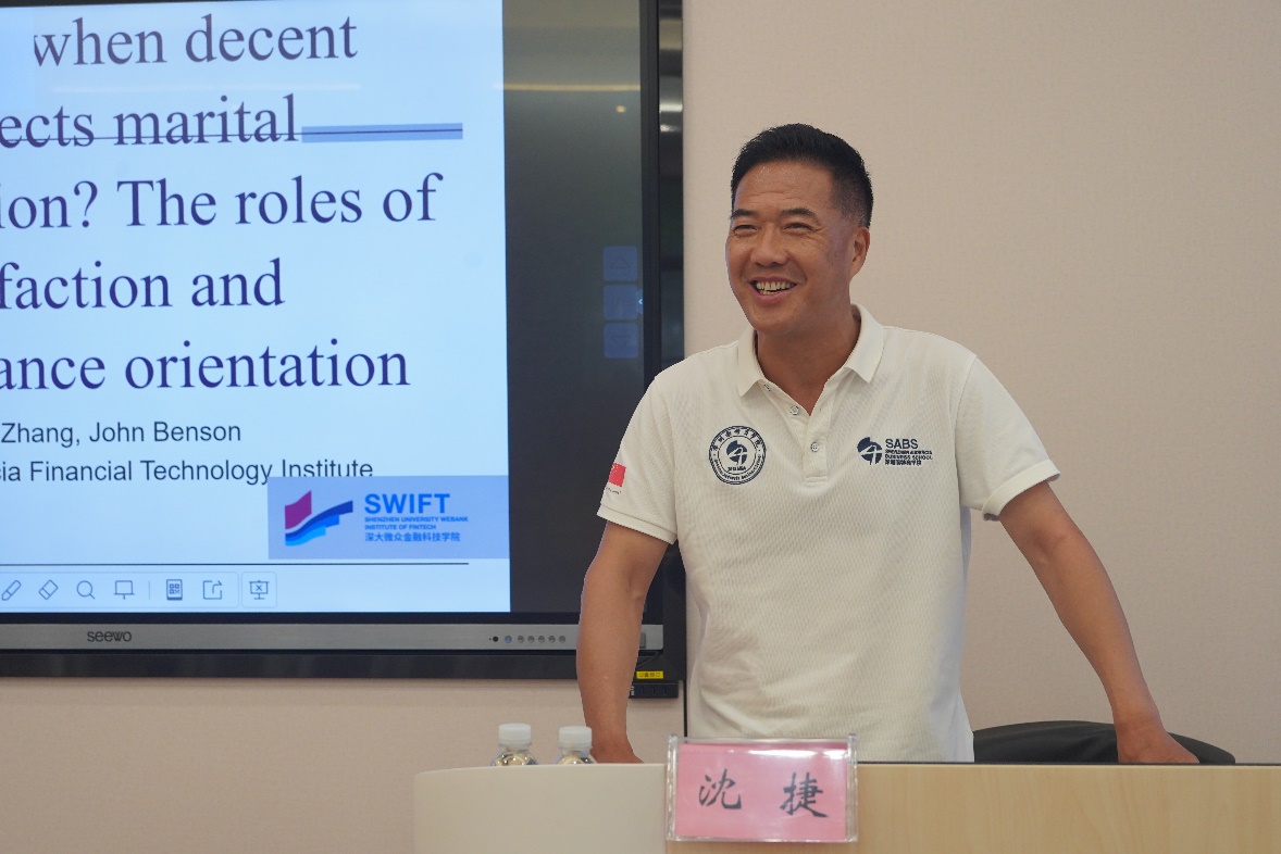 5月29日,深圳大学特聘教授、博士生导师沈捷教授受邀在学院122报告厅,以“How and when decent work affects marital satisfaction? The roles of job satisfaction and performance orientation”和“Theory applications in management research”为题为换妻游戏