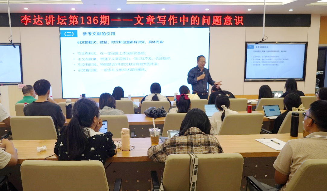 第136期“李达讲坛”,在122报告厅为师生们带来题为“文章写作中的问题意识”的学术报告。本次讲坛由学院副院长刘民坤教授主持,学院专任教师以及博士生、硕士生到场学习交流。