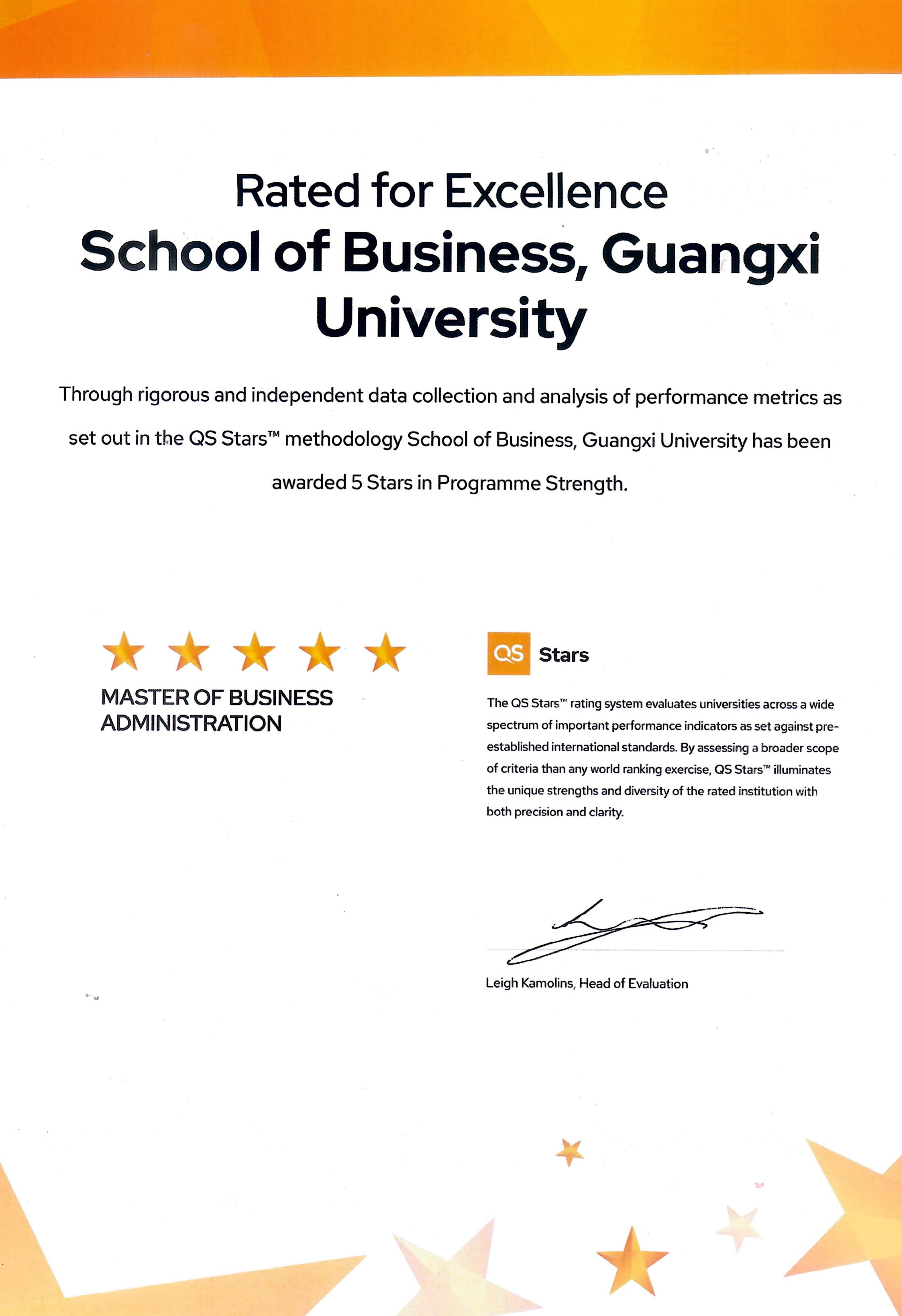 2024年11月5日,换妻游戏 MBA项目成功获得QS Stars五星评级认证,是全国第二家荣获QS Stars MBA专业五星认证的学院,也是广西首家获得五星认证的学院。